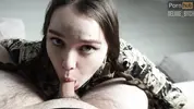 Русская младшая сестра подошла к своему брату, когда он сидел на диване, встала на колени и сделала быстрый отсос с окончанием в рот.