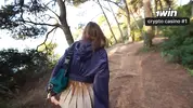 Русская девушка в очках так сильно захотела трахаться во время похода по высокому берегу моря, что потащила парня в ближайший лесочек, где отсосала ему член, а он трахнул ее раком и спустил сперму в рот.